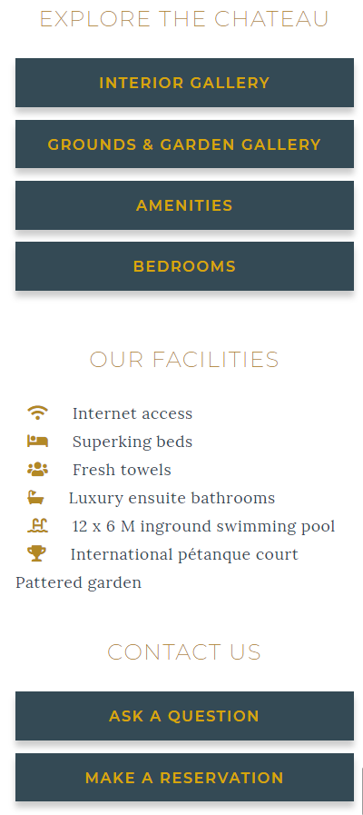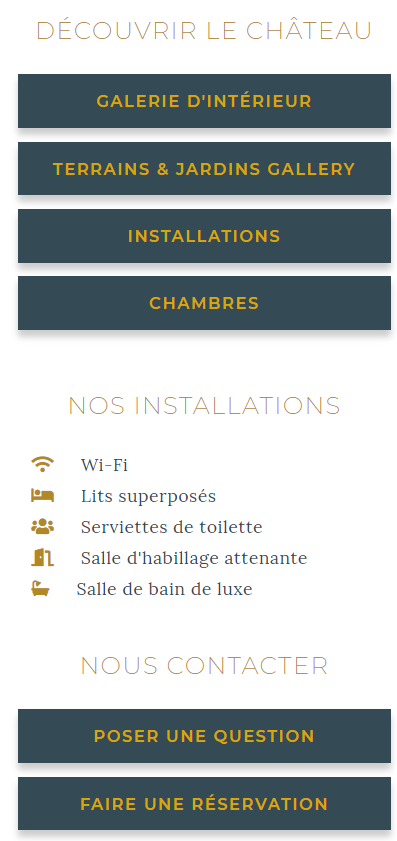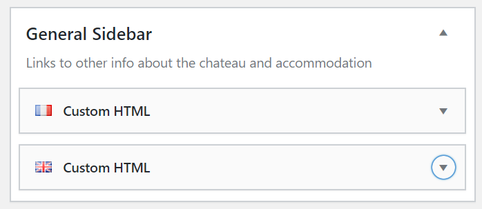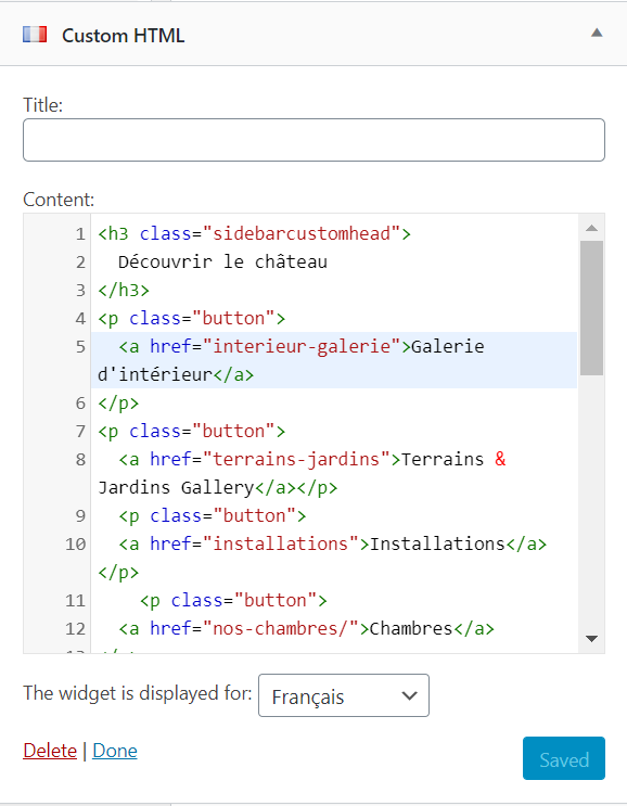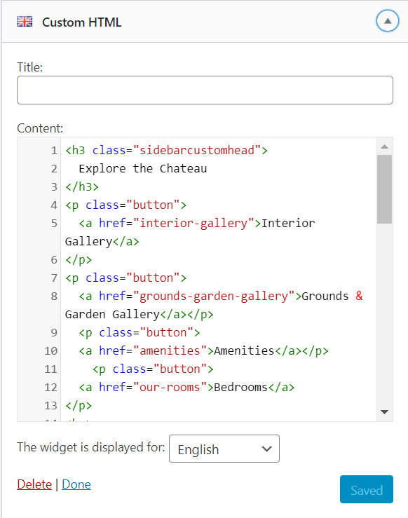 For these two classes to work, you must add these to the Custom CSS block in the Customiser. These two classes – sidebarcustomhead and button – define the layout of the header (e.g., in the English version, “Explore the Chateau”) and the button (e.g., in the English version, “Interior Gallery”).