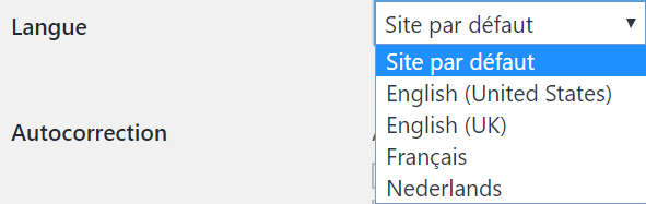 With your profile window open, scroll down through the Personal Options sections until you get to Language. Here you can choose from either the default or the list of installed languages. On this website I have four languages installed by default: English (United Kingdom), English (United States), Français, and Nederlands.