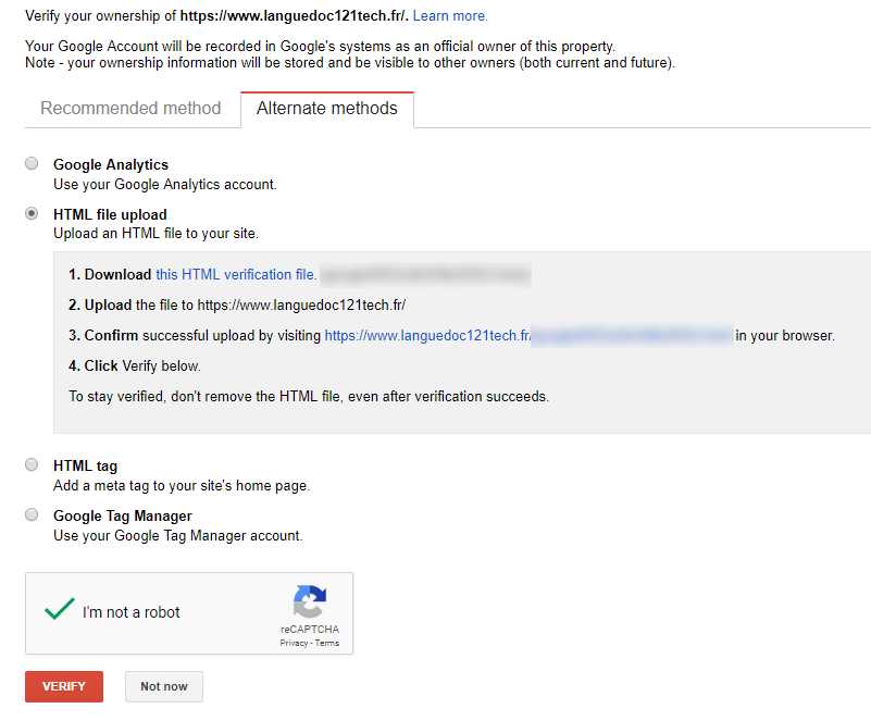 4. Select the Alternate Methods tab and choose your method. I like the HTML file upload method, which involves downloading a file and putting in the /public_html file on your site’s server. If you’ve been through the verification process with other non-HTTPS versions of your site, you don’t need to copy the file again.